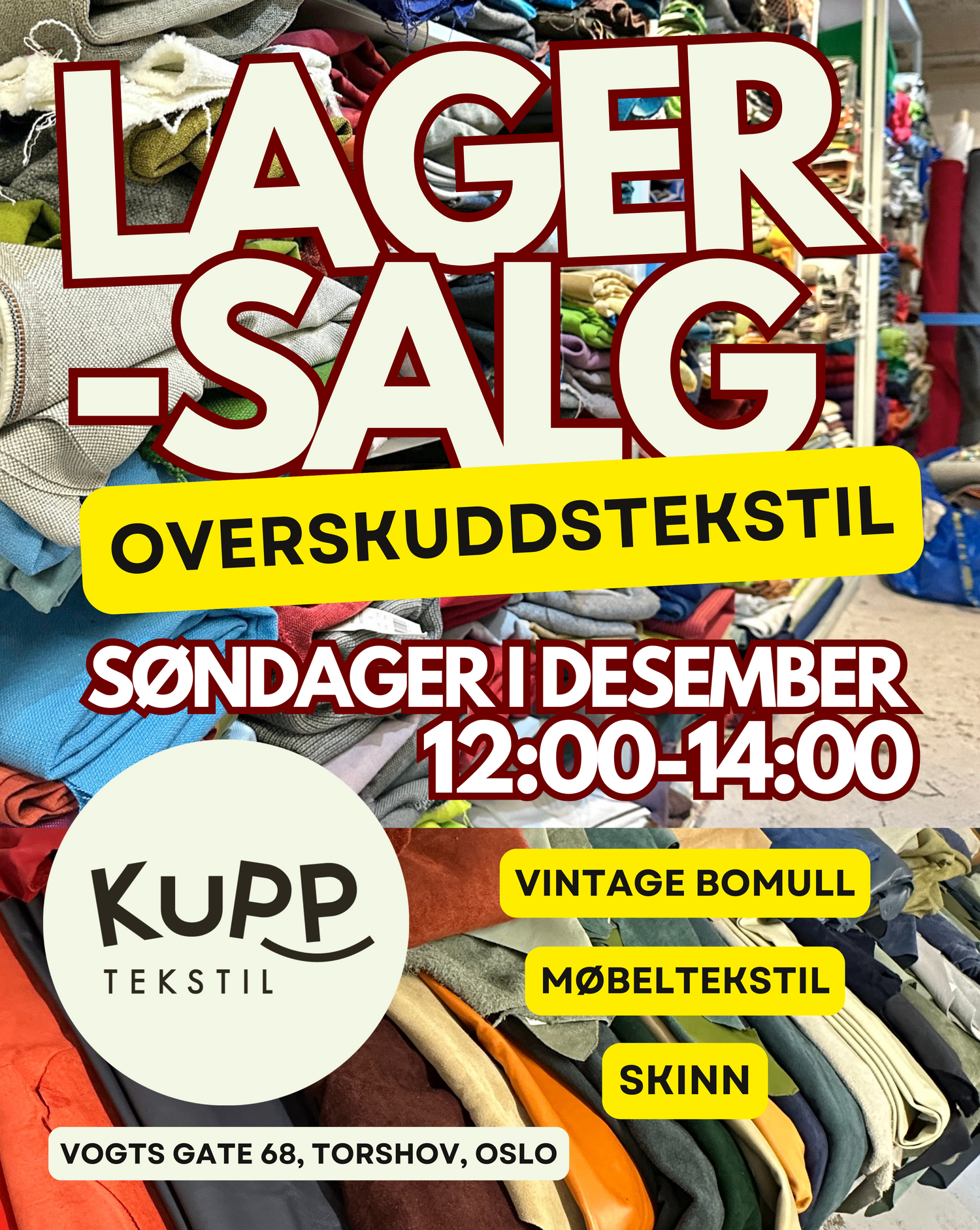 Her finner du et nøye kuratert utvalg av våre håndplukkede overskuddstekstiler fra butikken på Torshov. Hvert stykke selges i lengder på 2 meter.